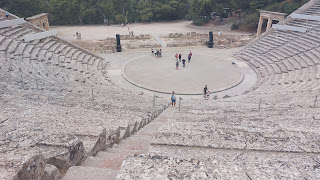 Délután 2-kor indultunk és röpke fél óra alatt el is értük az epidauroszi romkert melletti hatalmas parkolót. Gondolom a rendezvények, előadások miatt érkező nagyszámú autós vendégre tekintettel építettek ekkora parkolót, mert most, annak ellenére, hogy viszonylag sokan voltak a látogatók mégis nagyon-nagyon sok szabad hely maradt. A bejáratnál megvettük a 12€-s belépőket (romkert+múzeum) és már sétáltunk is Epidaurosz fő attrakciója a színház felé. A köztudatba azzal égette be magát Epidaurosz, hogy a színháza remek állapotban maradt meg és csodálatos az akusztikája (hmmm ... kipróbáltuk, nem vettük észre). Értem én, hogy valamivel fel kell hívni az emberek figyelmét, de az valahogy elsikkad a prospektusokban, hogy ez volt valamikor az egyik (talán az első és a legnagyobb) gyógyászati központ az ókori Hellaszban, ahova görögök, majd később a rómaiak sokasága járt gyógyulni és wellneszezni (no, ezt akkoriban biztos nem így mondták). Az ide érkező hatalmas tömeget testi, lelki vigasszal, szállásokkal kellett ellátni, biztosítani kellett a szórakozási, kikapcsolódási lehetőségeket is, emiatt épült a templomok mellett színház (fénykorában 14 000 ember tudott helyetfoglalni az üléseken) és stadion is a városban.